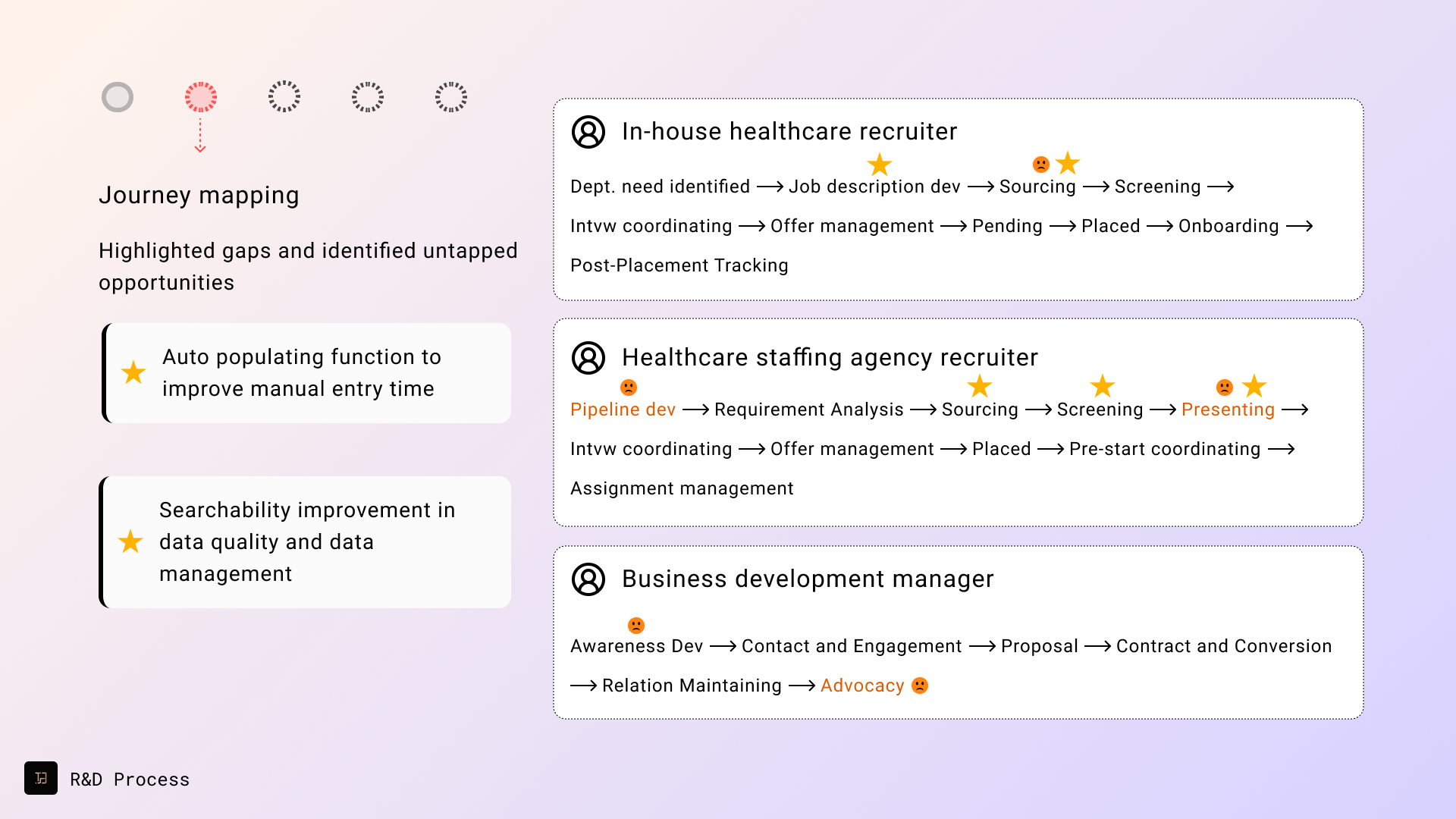 - Conducted user research to identify workflow inefficiencies and pinpoint specific recruiter pain points.