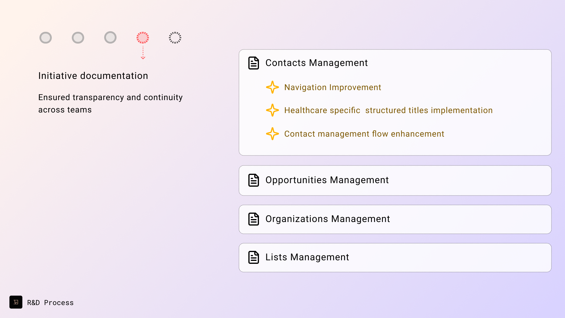 - Users could only group one item type per list, creating inefficiencies for managing contacts, organizations, or opportunities collectively.